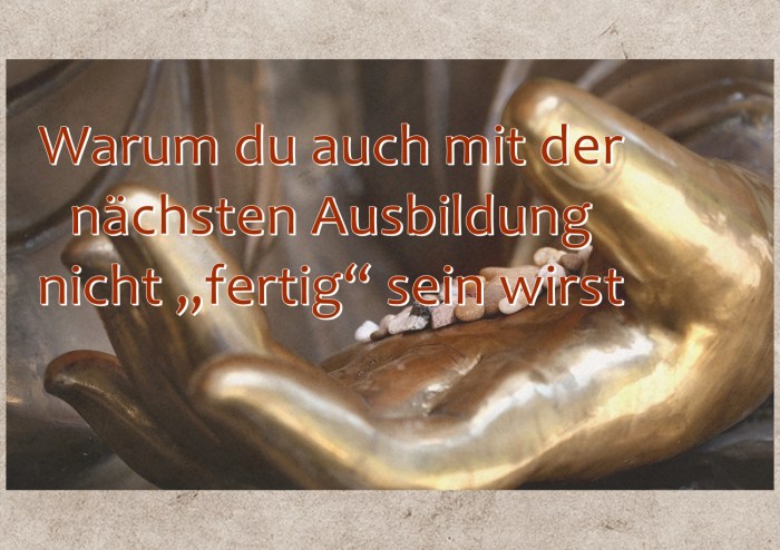 Gerade im spirituellen Bereich ist das Angebot an Ausbildungen so immens groß, dass du sehr schnell den Überblick verlieren kannst. Ein für mich immer wichtiger Beweggrund ist meine eigene Entwicklung. Und da bin ich mir ziemlich sicher, dass ich noch nicht alle Möglichkeiten ausgeschöpft habe. Stell dir vor ich würde damit warten bis ich fertig bin … Und wer weiß, ob ich in diesem Leben damit fertig werde …