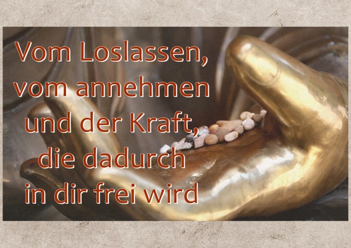 Loslassen heißt im Grunde annehmen. Denn du nimmst die Energie, die andere für dich bereithalten, manchmal auch tragen, wieder zu dir zurück. Loslassen nimmt dir im Grunde nichts. Es gibt dir. Es gibt dir eine Vollständigkeit zurück. Deine Seelenanteile, deine Kraft, deine Liebe, all das, was du an andere abgegeben hast, weil du vergessen hast, wie vollständig und einzigartig du bist.